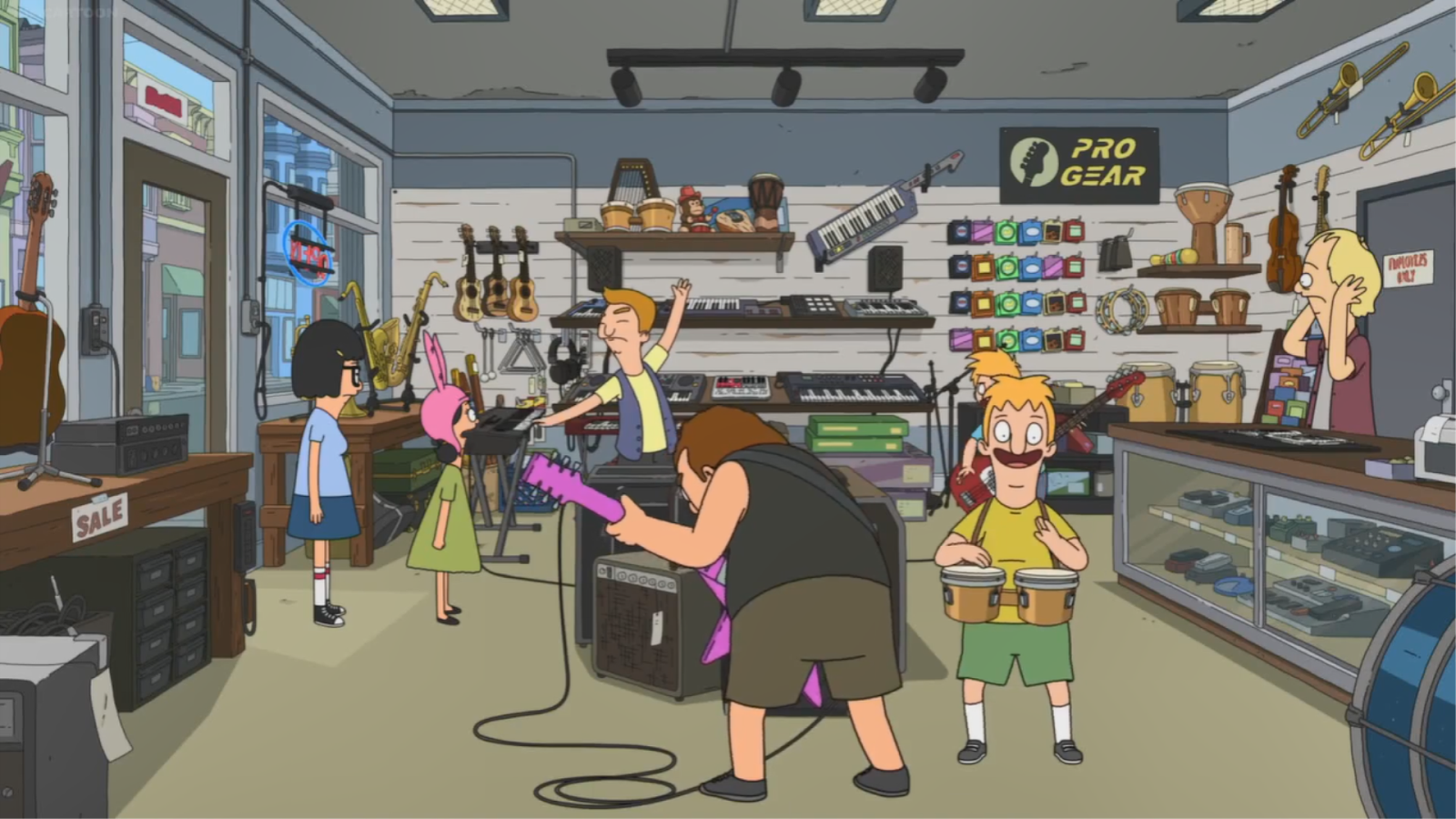 Starting off with the main plot with the Belcher kids walking on down on the sidewalk after school on their way home with Gene telling both Louise and Tina about the whole cafeteria fiasco where the lunch lady somehow got him less tater tots than the usual, which might as well be the first big scandal of the new year of not having more than taters than tots. You think that you somehow ordered 8 pieces of tater tots? Fuck you, you got seven. One less than you ordered. Someone should be fired for that. Gene decided to let his troubles to go away by dropping on by to the local Hi-Fi shop to mess around with the instruments, mostly on that one instrument that he’s been eying on for days, if not, weeks over at the shop. However both Tina and Louise are not too keen when it comes to the idea of Gene visiting the place one too many times, mostly because of the store owner having to endure his presence and him saying “You again” at him like Gene thinks it’s nothing more than a friendly gesture and trying out the drum machine and not paying for it. That’s like if you go to the mall food court and try out the samples from each of the restaurants that are present and try each one out but have no money nor the time to get the full experience and keep on hopping by time after time. That pretty much sums up Gene and his visit to that store that he and the Belcher sisters are now entering with of course, the store owner, named Dino, saying “You again.”