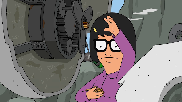 Tina comes to Louise and Gene’s aid as they struggle to get the legs up and the machine to work. Feels bad for leaving them hanging and for them to deal with the consequences of their actions and decides to bail her siblings out of the mess that they caused. And how is she going to fix that? Why by using a pack of pencils to fix the machine to attach the legs. How? How would that work? Think of the most obvious question...where she did pick that up?! How or where in the ever living fuck did she ever pick up the idea of using pencils to fix a machine like an animatronic yeti at a golf course?! Where did she learn that? Who told her that? I get that the series is episodic and continuity is as rare as a team that had no shot of winning a game beating a heavily favored team in the biggest tournament in the world, but...how?! Where?! I may have to call bullshit. I may have to call bullshit on this one. Like I'm sorry, but I'm calling bullshit on this one. Somebody needs to explain it.