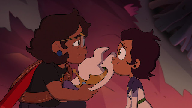 We get to some sentimental scenes with this episode. Starting with Luz and Camila when hiding in retreat mode when taking on Kikimora where you have Luz continuing to beat herself down with the damage she caused regarding everything months ago that might’ve doomed everyone in the Demon Realm and in this scene, you have Luz beating herself down once more because of everything that went out of control. And you have Camila comforting her daughter and saying that she didn’t mess anything up and telling her that’s a part of life where you’re going to mess things up and that’s alright. Especially when she found a vlog of Luz declaring that she would not make a return to the Demon Realm for good once the whole situation with Belos and The Collector blows over from the last episode because of fears that she’ll mess up even more. But Camila makes sure that what Luz said about what she wanted to do once the issue is done won’t be the case because you have her apologizing to her daughter for wanting to be someone she is not, that being the whole thing with Luz being sent to summer camp to be normal and confessed that she doesn’t want to do that. This causes Camila to reveal her nerdy side to Luz, her actual side because mind you, in the previous episode, you have that little dream sequence with her feeling the pressure from a few people in public and the principal of Luz’s school about Luz’s behavior despite that she was only being herself. Her being bullied and having to deal with the pressure of being a single mom since Manny’s passing. Camila apologizes to Luz for be too protective and it is at that point where Luz’s palisman egg decides to hatch because that is something that Luz wants and that is to be understood. But it’s not just Luz and Camila who had their come to Jesus moment...